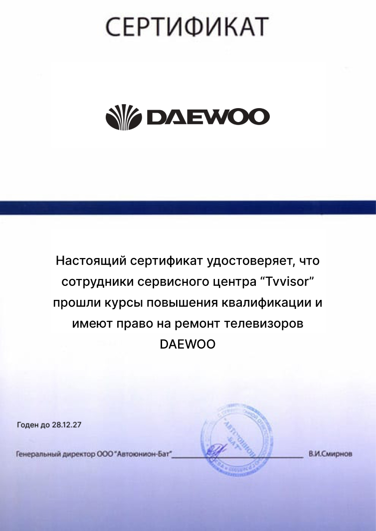 Ремонт телевизоров Daewoo в Москве – это та сфера ремонта телевизоров, в которой услуги нашей компании отточены до самого высокого уровня. Если нужен ремонт ТВ Daewoo – обратитесь в TV Visor!