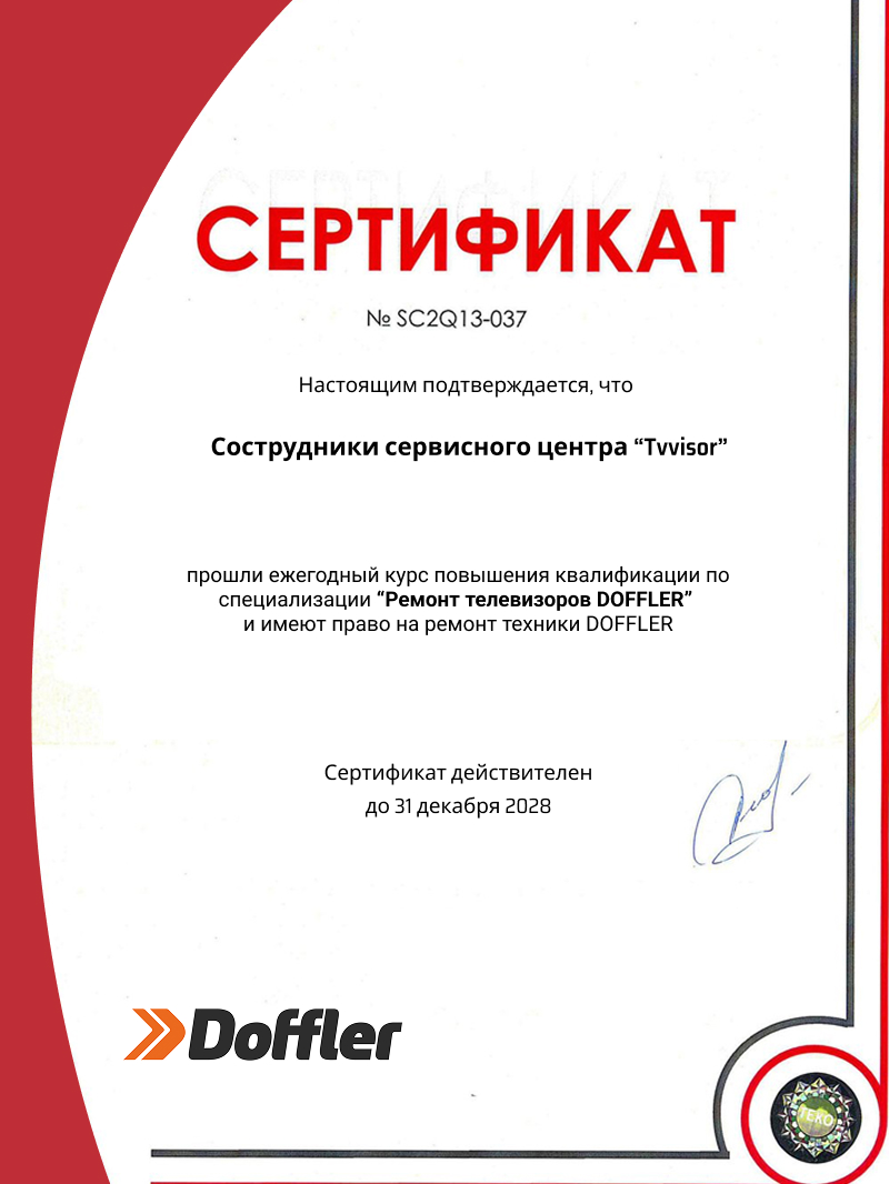 Нужен ремонт телевизора Doffler? Проведем тщательную диагностику, восстановим подсветку, питание, тюнер, HDMI/USB, Wi‑Fi, обновим ПО. Устраняем мерцание, шум, рябь и отсутствие изображения. Сертифицированные комплектующие, гарантия. Принимаем в сервисе и с выездом по Москве и области, честные цены.