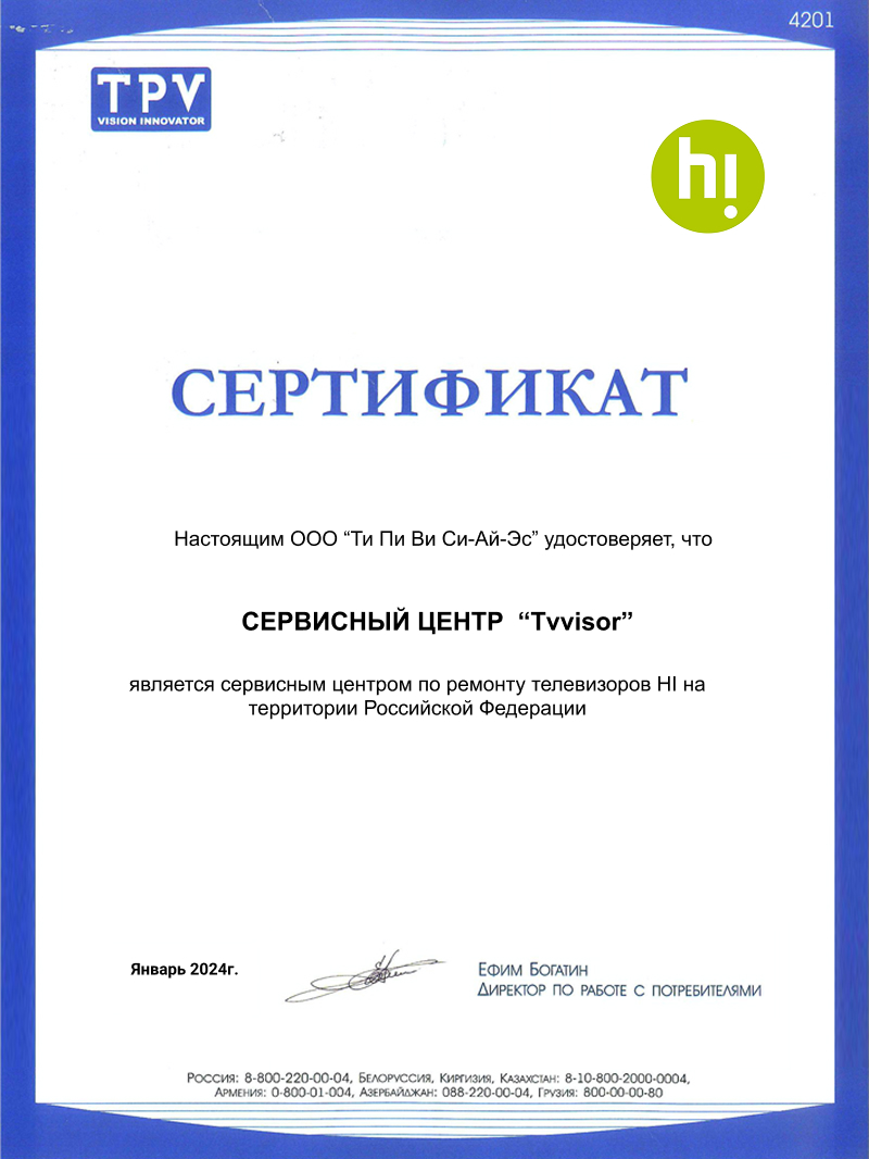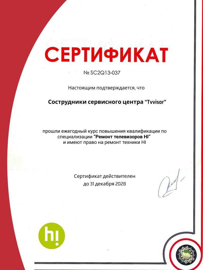 Нужен ремонт телевизоров Hi? Сервис ТВ Визор предлагает бесплатный приезд и диагностику с последующим срочным ремонтом, обычно за 2 часа в день обращения. Решаем проблемы подсветки, питания, материнской платы, USB и Smart TV; применяем оригинальные запчасти, выдаём документы и гарантию 2 года, по итогу картинка детальная, звук ровный.