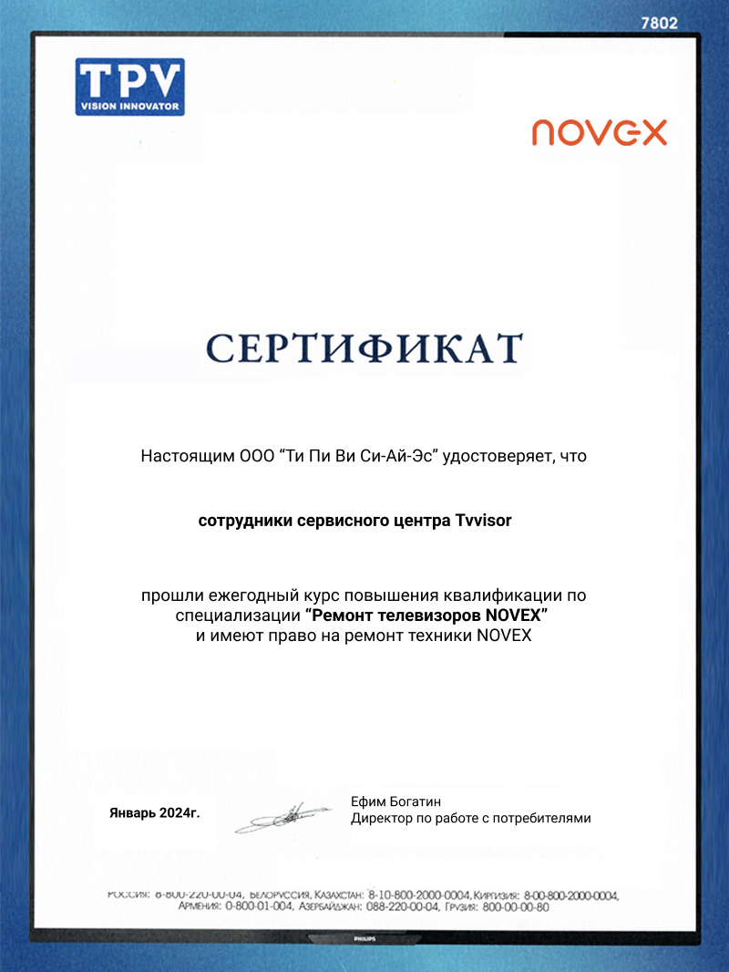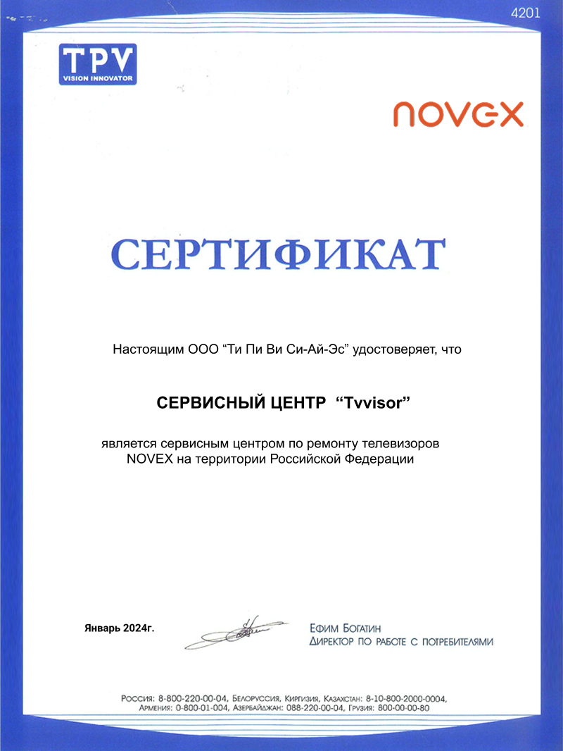 Ищете ремонт телевизора Novex? ТВ Визор быстро определит причину неисправности: мерцание, отсутствие звука, проблемы с Wi‑Fi или каналами. Ремонт подсветки, БП, разъемов, материнской платы, обновление ПО. Качественные комплектующие, гарантия на работы. Принимаем в сервисе и выезжаем по Москве и области, предоставляем понятные консультации и смету.
