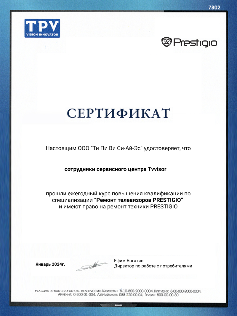 Нужен ремонт телевизора Prestigio? Сервисный центр ТВ Визор оперативно восстановит технику: точная диагностика, ремонт плат, подсветки, тюнера, обновление прошивки. Используем оригинальные запчасти, даем гарантию. Возможен выезд мастера по Москве и области. Прозрачные цены, сроки от 1 дня. Звоните — вернем вашему Prestigio яркое изображение и стабильный звук!