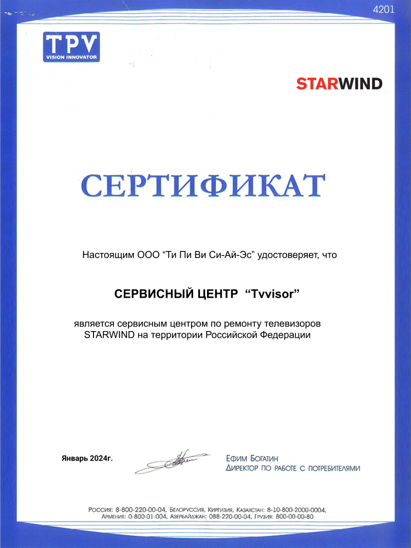 Нужен ремонт телевизора Starwind? Сервисный центр ТВ Визор проведет точную диагностику, восстановит подсветку, блок питания, материнскую плату, тюнер, разъемы HDMI/USB, обновит прошивку и сетевые модули. Используем оригинальные или сертифицированные запчасти, даем гарантию. Принимаем в сервисе и выезжаем по Москве и области, формируем прозрачную смету.