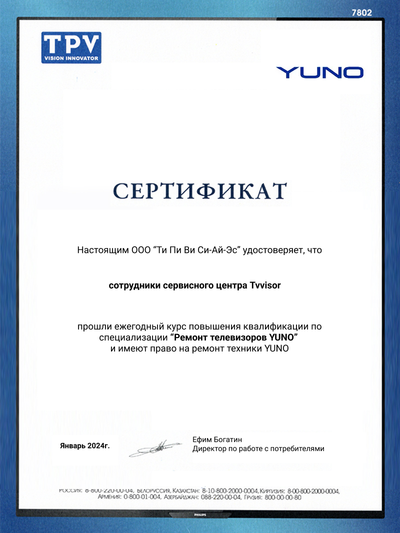 Чтобы вызвать мастера для ремонта телевизора Yuno, вы можете: